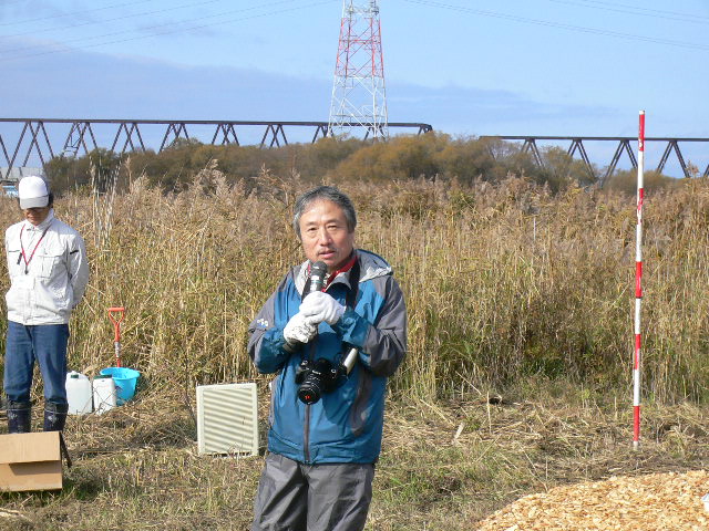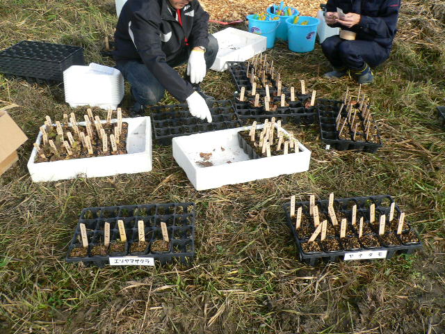 11/6石狩川の河川敷で岡村教授指導のもと、 自然再生法による植樹に参加しました。 12名で50本の苗木を植樹。 苗木は河畔林で採取し、種から作られた物で、 外来種でなく日本固有の樹木とのお話でした。