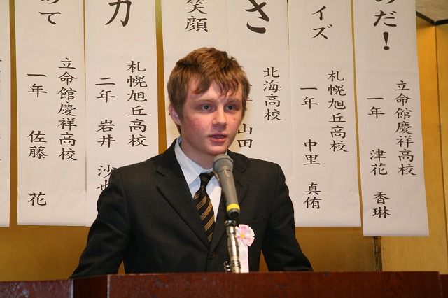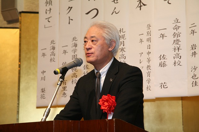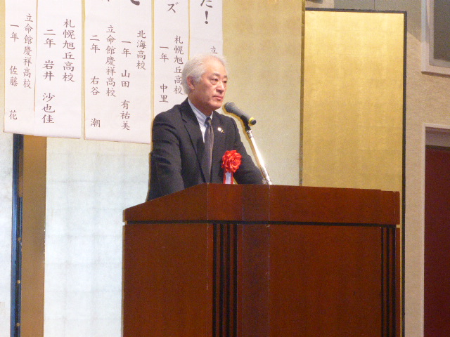 高校生は論旨・表現を北海道新聞社 村山 健審査委員長はじめ7名で審査。集計表を見ると評価点数伯仲しておりましたが僅差で最優秀賞並びに北海道新聞社賞等各賞が決まり会長から賞状・盾・記念品が渡されました。