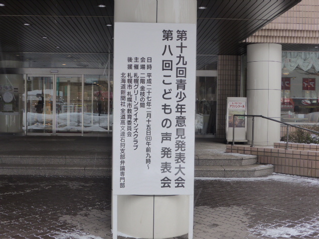 札幌グリーンライオンズクラブが主催する「青少年意見発表会」及び「こどもの声発表会」を総勢181名の参加で2月15日(日)8:30〜13:30 ホテル札幌サンプラザにて開催致しました。キャビネットからL三澤 聖一地区ガバナー、L諏訪 昇三ゾーンチェアパーソン、L川原 護青少年YCE委員長をゲストにお迎えしました。