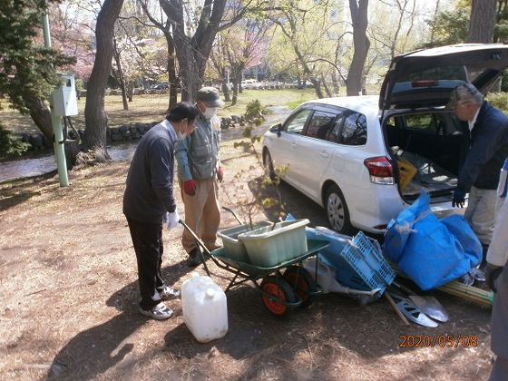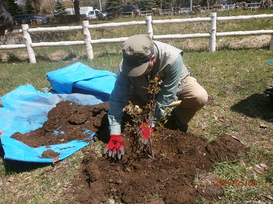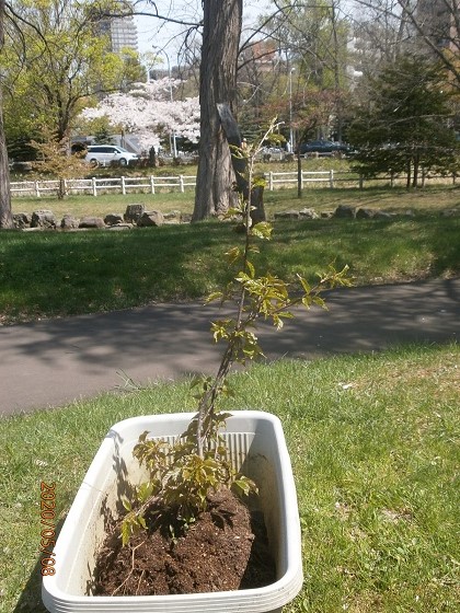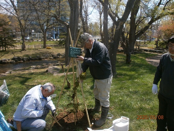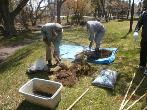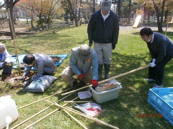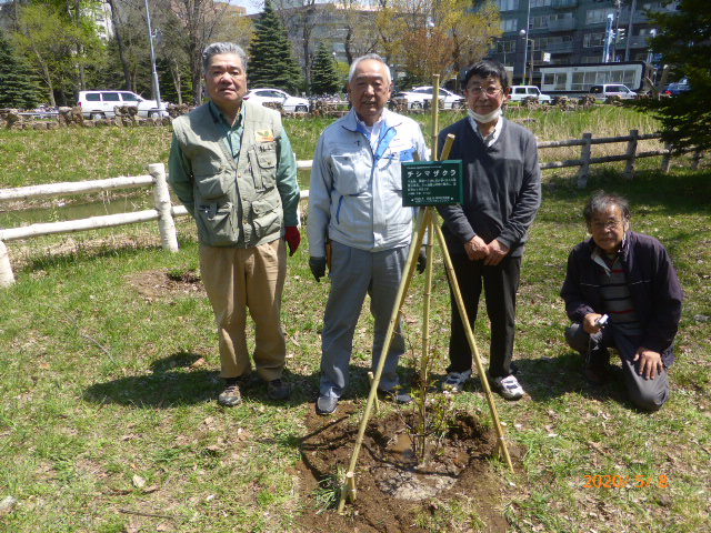 CN25記念植樹 5/8中島公園内にCN25を記念しクラブ農園部会で育てたチシマサクラ苗木3本を植樹する。