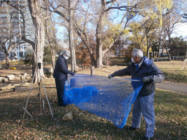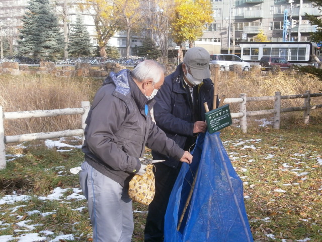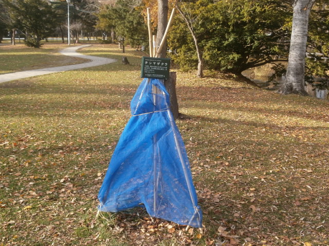 11月25日、中島公園護国神社側で本年5月に記念植樹したチシマザクラ3本の冬囲いをL比護、L岡山、L工藤で実施して来ました。植えるだけでなく、しっかりアフターフォローする処が我がクラブの強み。今回が初めての冬囲いで“にわか庭師"は悪戦苦闘しましたがこの後、回を重ねると上達すると思われます。来年4月の冬囲い撤去、忘れない様にしなくては・・・