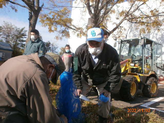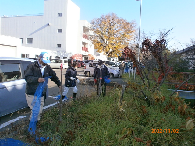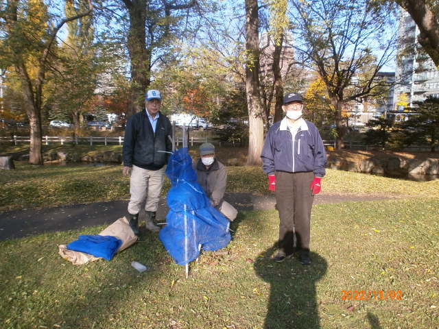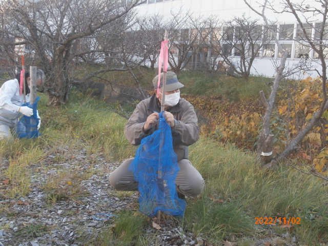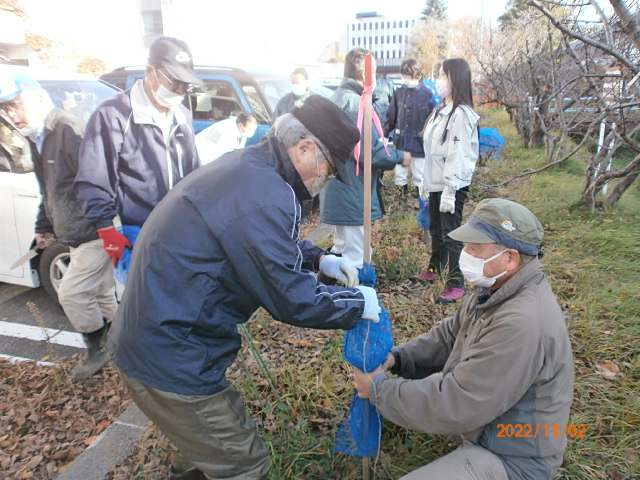 11月2日 13:00から寒地土木研究所構内のチシマザクラ幼木に職員さんと共に冬囲い実施。晴天に恵まれL堀束・L比護・L忠海・L工藤が参加しました。慣れてない方も居られ冬囲い方法をL堀束に指導戴きました。 その2 寒地土木終了後CN25記念事業として中島公園護国神社側に植樹した3本のチシマザクラに冬囲い。1m位に成長してます。2〜3年すれば冬囲いしなくて良くなるかも?その際、中島公園管理事務所所長とお逢いしその場でのお話の中、我クラブで樹名板設置した経緯を初めて知りました。近隣小学校の先生が子供たちを連れてきた際「この木何の木?」と質問を受けた際正確に答えられない場面有る。樹名板により木の名前が分かり結果、子供たちが知識を持ち木に、自然に親しみ湧く。勿論、子供たちだけでなく大人の市民も同様。何気なしに点検作業してましたが「いい事してる!役に立ってる!」実感が湧き点検作業継続のエネルギーが湧きました。ちなみに2016年から5年に渡り330枚の樹名板を設置してます。 |