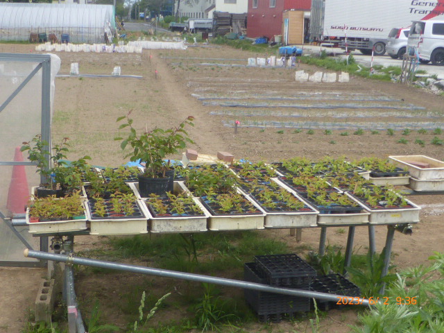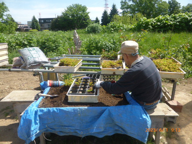 6月1日、グリーン農園で一年前採種し10p程度に成長したチシマザクラ苗を10.5pポットに植え替え。総数150ポット位出来るかな?との予想でしたが最終的に255ポット作成。立ち枯れ考えても200ポットは市民頒布出来ると思います。