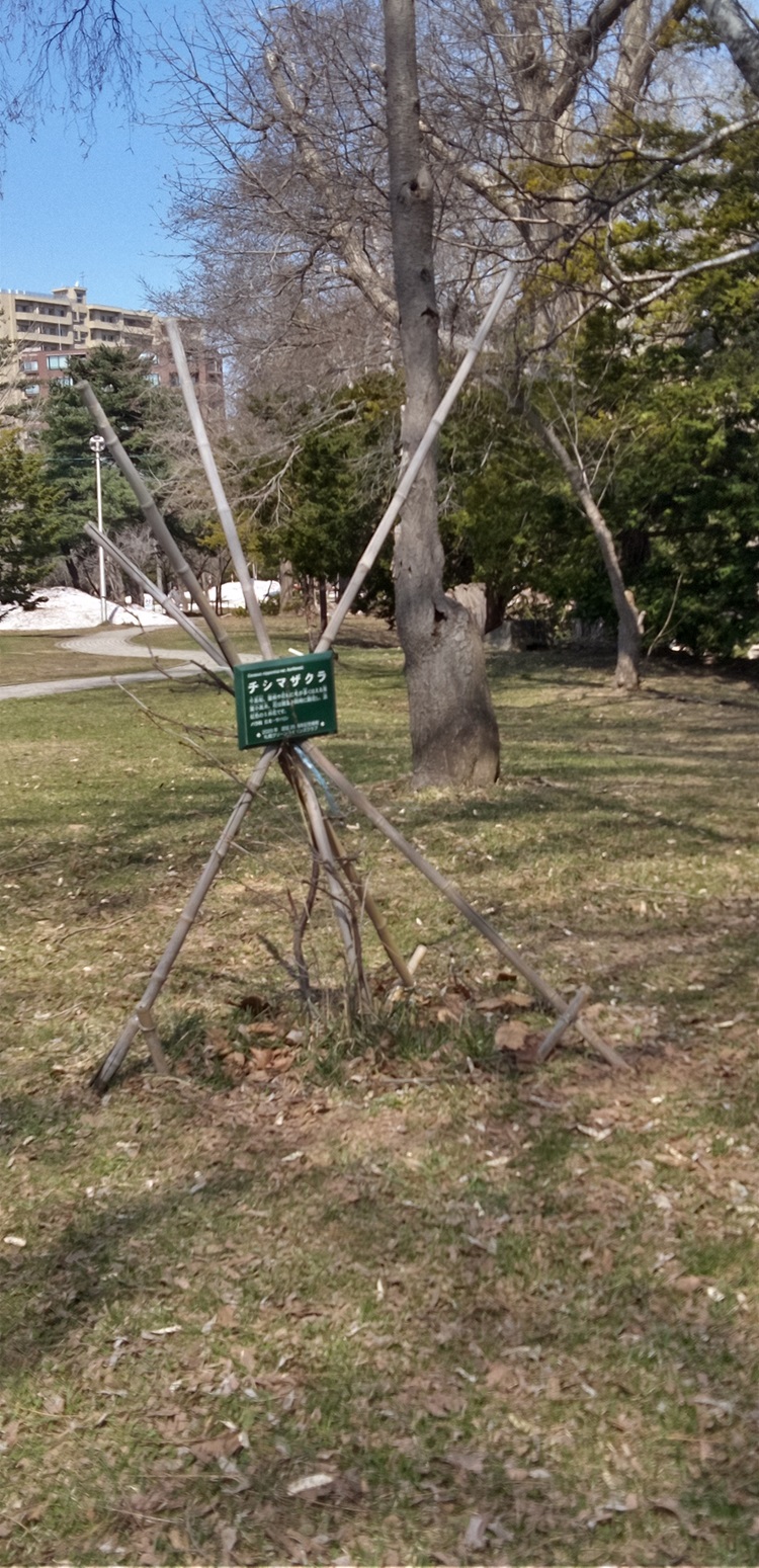 4月13日(金)CN25に記念植樹した中島公園チシマザクラ3本の冬囲い取外アクティビティをL比護・L工藤で実施。現在樹高1m位。樹高・枝の張り具合、いわゆる樹勢から判断し"今回で冬囲い終了"とするのは時期尚早との結論としました。支柱の傷みもあり秋の冬囲い時再度作り直しする事としました。