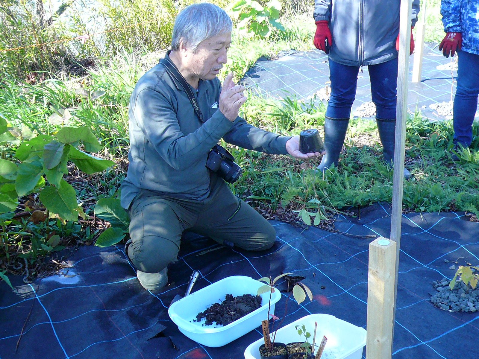 岡本先生の植樹の作業説明 |