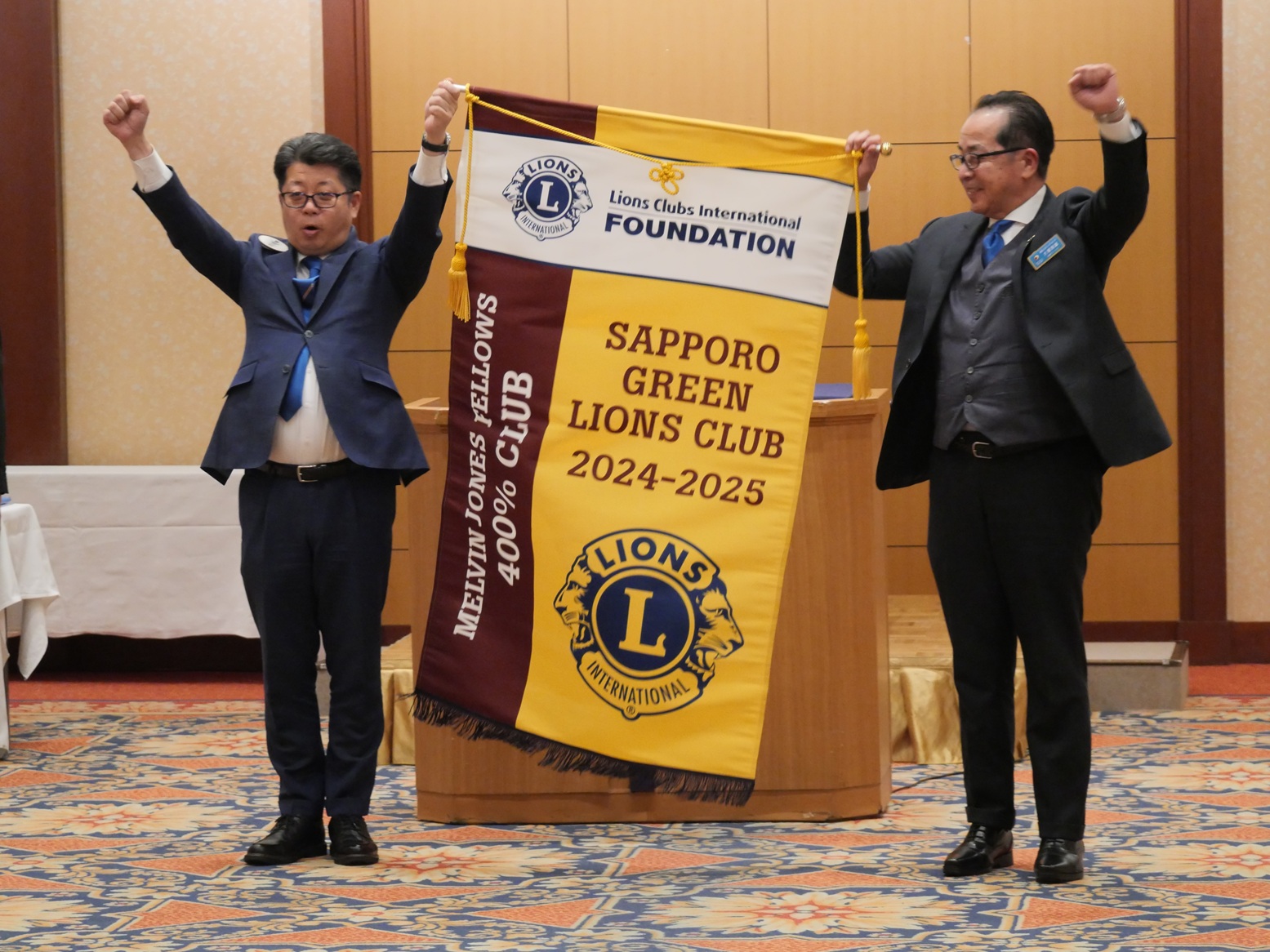 ライオンズクラブにはライオンズクラブ国際財団(以下LCIF)と言う組織があります。そこに寄贈された基金全額が世界の人類福祉に貢献する事を目的とし、組織運営費用に充てることはありません。直近例としてLCIFはウクライナのこども達に心的外傷後ストレス障害(PTSD)支援や昨年能登半島地震被害にLCIF支援金を送っています。今年設立30周年を迎える我クラブは遡る事25年前、2005年を初回とし以降5年毎に記念事業の一つとして毎回会員1人当たり1000ドル相当の寄付を実施して来ました。(MJF100%・MJF200%・ブルークラブ・MJF300%)今回の400%は5回目となります。この取組に対し2月10日キャビネット会議の場でMJF400%バナー(表彰旗)授与式が執り行われ、L帆先会長に代わりL大塚がLCIF理事長に代わるL美田ガバナーからバナーを受け取りました。先日の青少年意見発表会同様、長期に渡る我クラブ基幹アクティビティです。