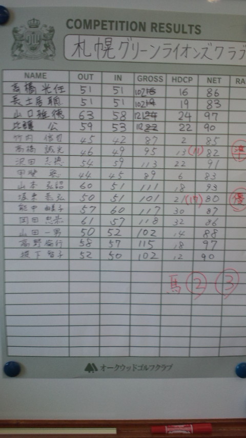 今日は本州方面は台風で大変な状況でしたが、天気も ほどほどで風もなく良いコンディションでプレーできました。 先日までの暑さも無く、すっかり秋らしくなり、少し寒いくらいでした。 コースは平日と言うこともあり、ピンの位置が斜面の中ほどに斬られていたり して非常に難しく3パットが続出でした。 次回は10月19日(水)ザ・ノース カントリーです。