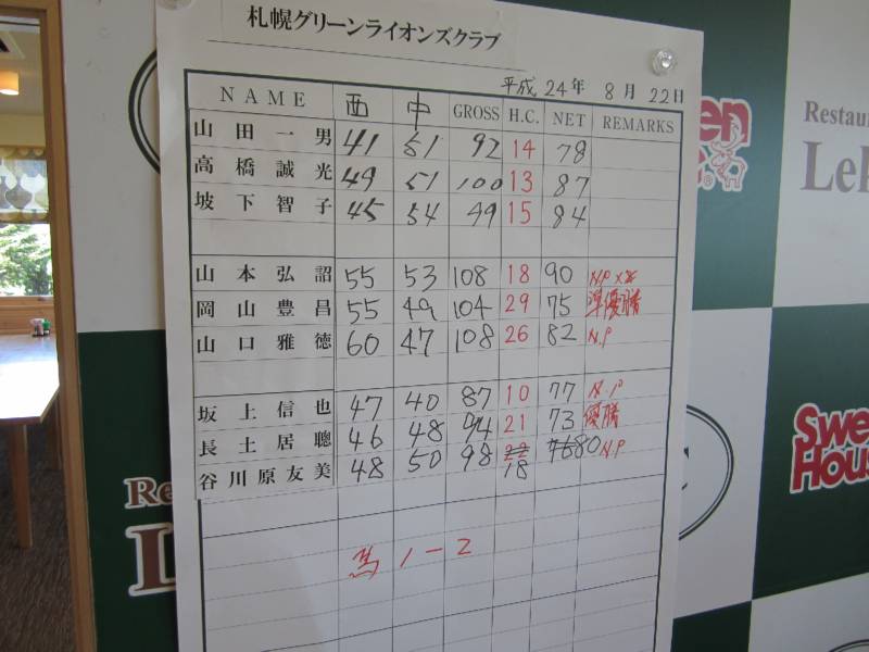 最高気温が報じられている22日、改造なったスエ−デンヒルズCCで第4回例会開催し、連覇を狙う前回優勝の前会長谷川原さんはじめ、過去優勝経験豊富な精鋭が集い熾烈なプレーを楽しみましたが、HCに助けられた長土居Lと岡山Lが優勝、準優勝の栄誉に浴しました。ニヤピンは各ホール業師が制し流石でした。 次回は羊が丘CCですので、多数の参加期待しております。