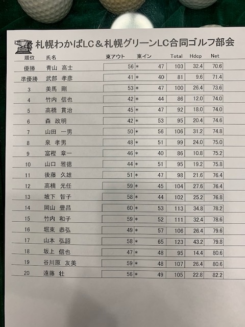 8月のゴルフ部会は札幌わかばLCとの合同コンペを開催いたしました。雨の中のゴルフで皆さんスコアメイクに苦しむ内容となりましたが、楽しいラウンドになりました。優勝は札幌わかばLCの青山L、準優勝は札幌わかばLCの武部Lでした。チーム対抗ではないですが、札幌わかばLCに惨敗の結果となりました。 次回はリベンジしたいと思います!
