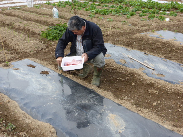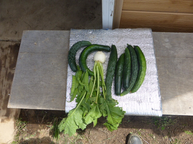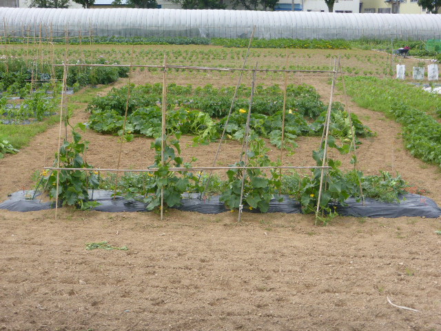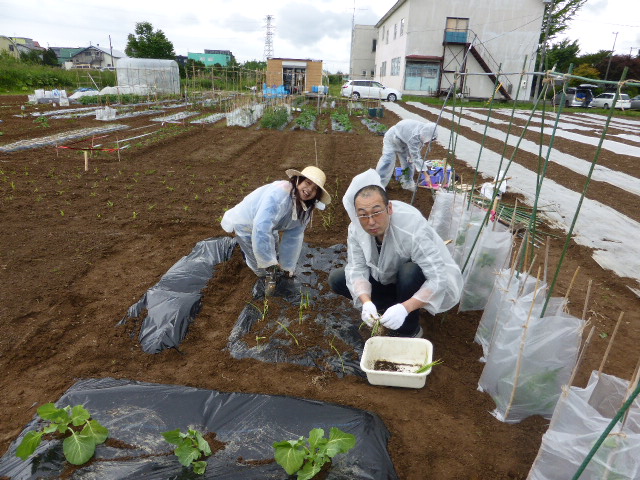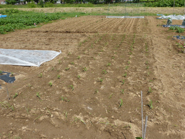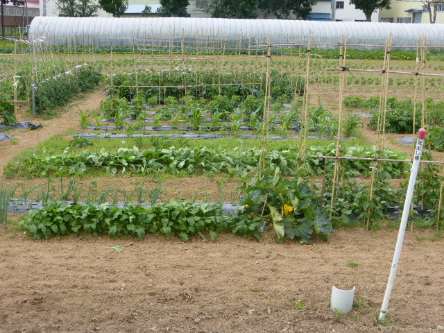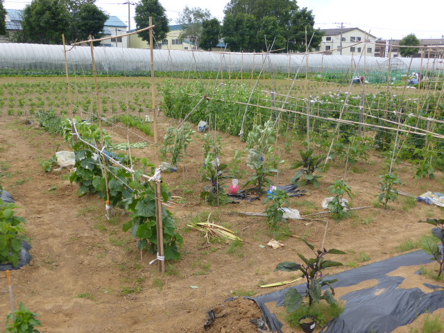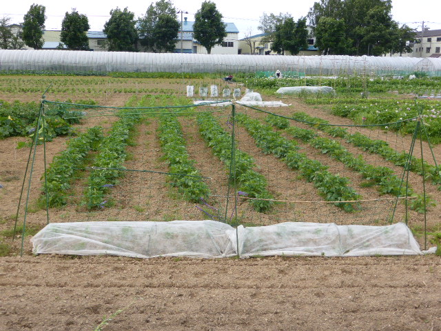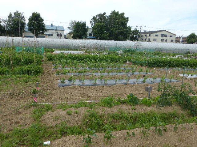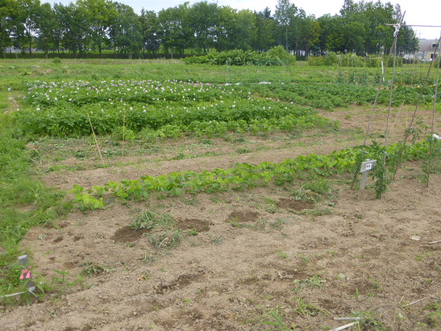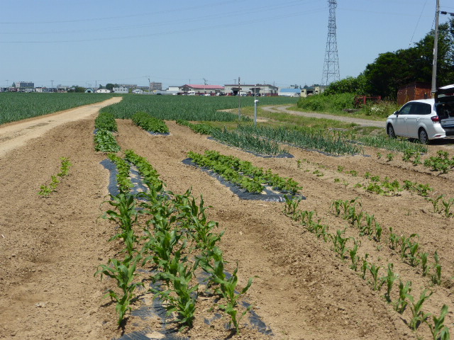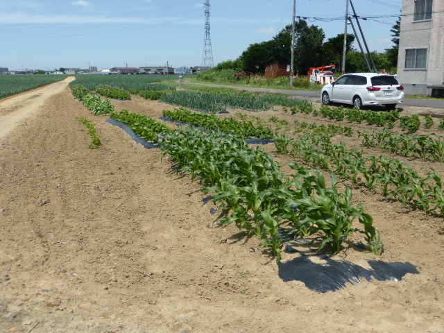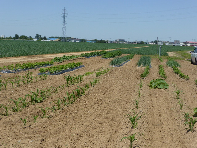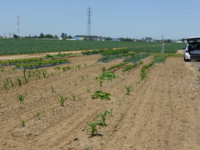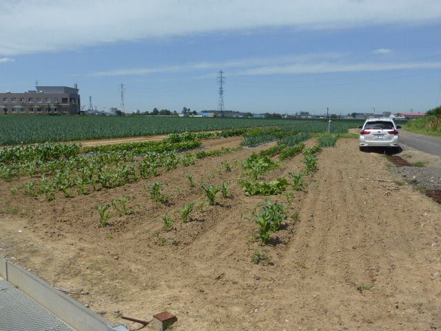暑い日が何日か続き、各作物は順調に生育し丘珠の絹サヤ・ピーマン・胡瓜等は収穫が始まりました。L比護農園のカブが「ねこぶ病」で全滅、新しい畑故前作で何を作ったか又何に適してるか分らず残念でした。根菜類は収穫してみないと出来栄えが分らないようです。26年から作付始まった上篠路は予定通りに生育しており、もうじき春大根が収穫できそうです。