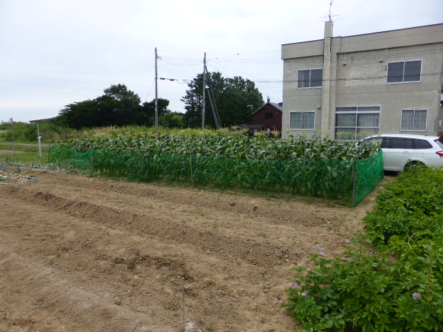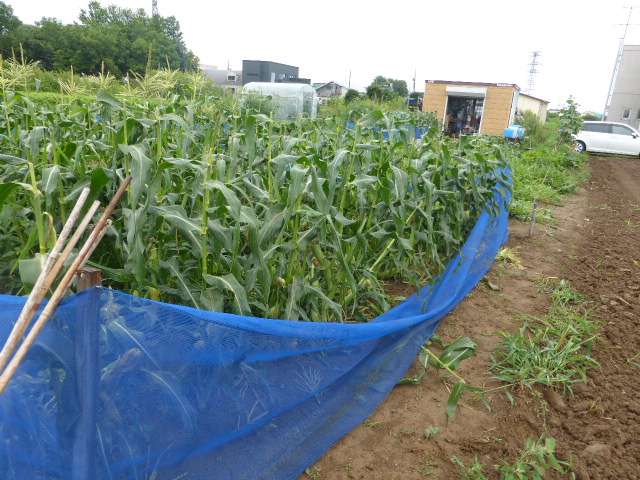 今年の丘珠トウモロコシは良い出来そろそろ収穫しようかなー 直前8/13にアライグマの被害に今年初めて遭い、L岡田 忠恭とL比護 了造のトウモロコシ全滅、L新松 茂とL前田 伏樹のトウモロコシ一部被害。被害本数はおおよそ150本位です。狐対策ネットで囲んでましたが、アライグマには全然効果なしです、狐は数本しか食べませんがアライグマは根こそぎ綺麗に食べます、多分団体で食べに来たと思われます。地主さんのハウスも被害700本全滅です。篠路は無事でしたので収穫し道具小屋で茹でラップ冷凍し9/17「森の教室」に提供、また、芋・玉葱・人参・ねぎも予定通り準備してます。現在残りの枝豆・芋など収穫しており、播種した秋大根の収穫が今後の楽しみです。