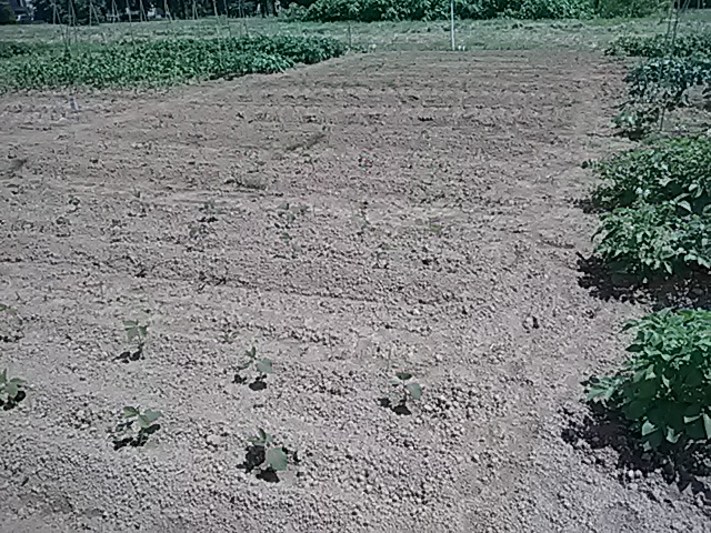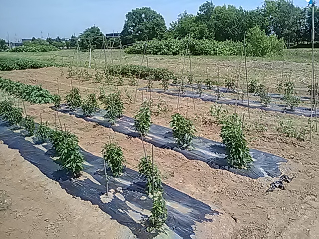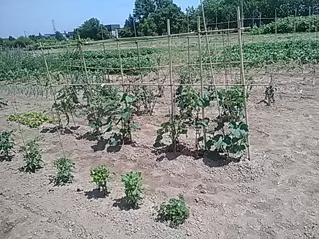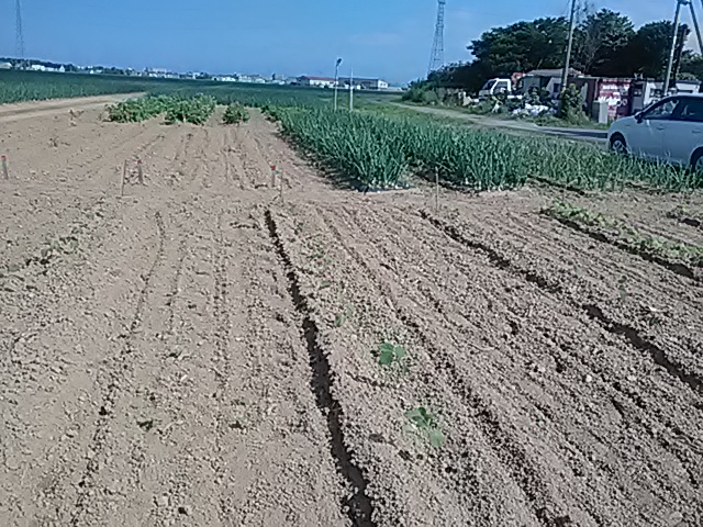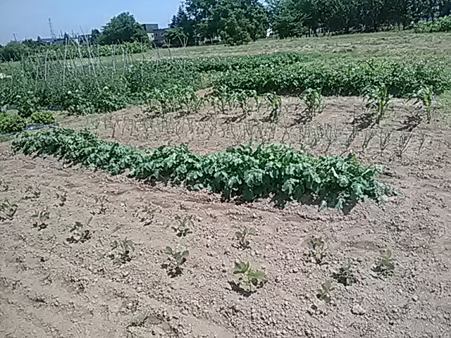 雨の少ない日が続き畑干上るが、6/28・29と7/3に3日間で50mmの雨。作物急に元気を取り戻す、そしてゴボウ44日・トウモロコシ26日・人参23日ぶりに発芽。全体に生育遅ぎみ今後の天候に期待してます。7/4L岡田忠恭 胡瓜・Pマン・しし唐初収穫。