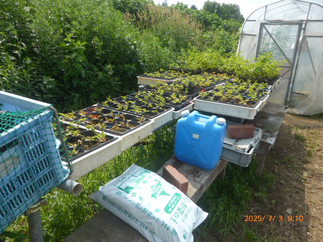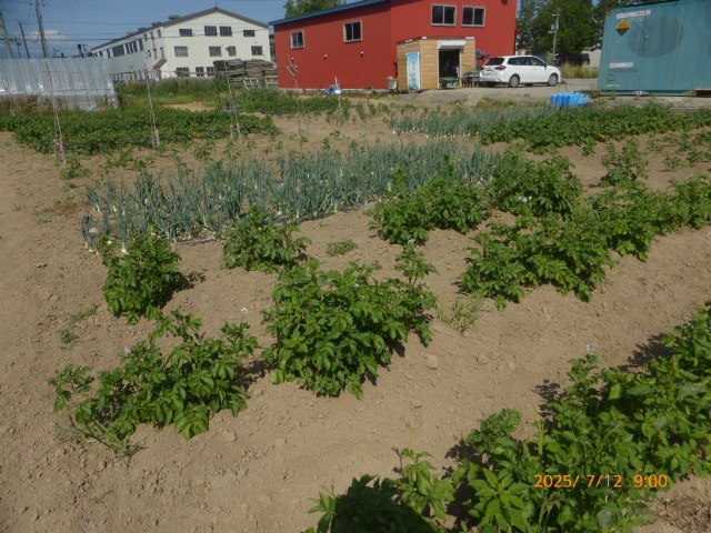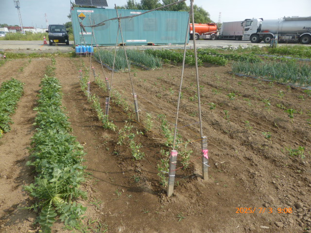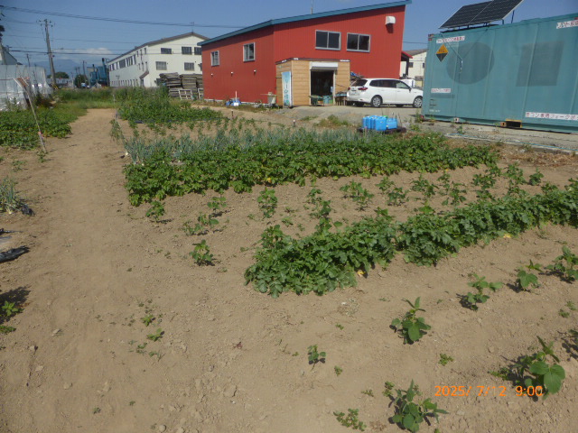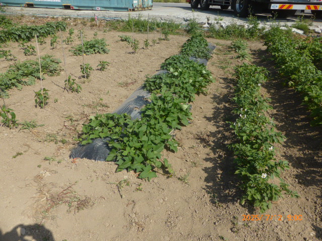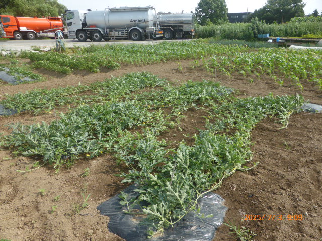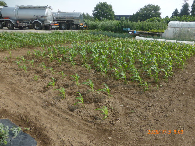 6月はほとんど雨降らず、7月は毎日30度越えの日が続き雨が降りません。作物はそれなりに生育してますが収穫は?です。又、昨年は鶏糞を大量に施肥したが、今年は去年の4割位に抑えた影響もあり、生育が悪い作物もあります。トウモロコシは全員の作付けを1ヶ所にまとめましたが苗を作りすぎ定植間隔狭く、肥料不足になり一部の葉が枯れてきたので急いで追肥散水した結果?です。西瓜、籠被せ遅れアライグマの被害に遭う。絹サヤほぼ全滅し新たな苗作ってますが時期が遅れてるので此れも?です。未だ高温少雨が続くので、散水が毎日の仕事になります。
