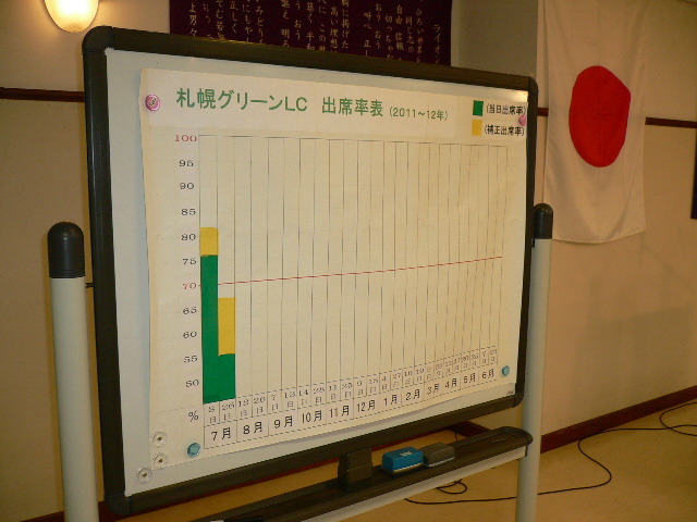 MJFのラベルピン授与 L高野 45回目 がありました。おめでとうございます。 審議事項としては、 ○前期7月〜6月までの決算報告、会計監査報告と今期の予算(案)について ○環境保全委員会の中島公園の(樹名板)設置継続ACTについて、ACT費用24万円 ○青少年委員会より全国青年弁論大会に伴う後援及び賞状盾の寄贈依頼について予算1万円 等がありましたが承認されました。 幹事報告としては、11月5日は宝塚グリーンLCCN40周年記念例会の参加について、L谷川原、L忠海、L岡田忠恭の三名出席予定。 10月16日、岡山せとうちLC25周年式典、祝宴について、姉妹クラブですので多数の参加お願いいたします(〆切8月末) 環境保全委員会より8月27日(土)14:00より二時間くらい中島公園の樹名板設置ACTのお手伝いの参加よろしくお願いします。 今日はお盆前のせいか少し寂しい例会でした。出席率表をつくりましたので棒グラフが伸びますように例会出席をよろしくお願いいたします。 今日のゲストL高橋光任のお孫さんのなっちゃんが久しぶりに来ました。小学二年生と大きくなりました。 |