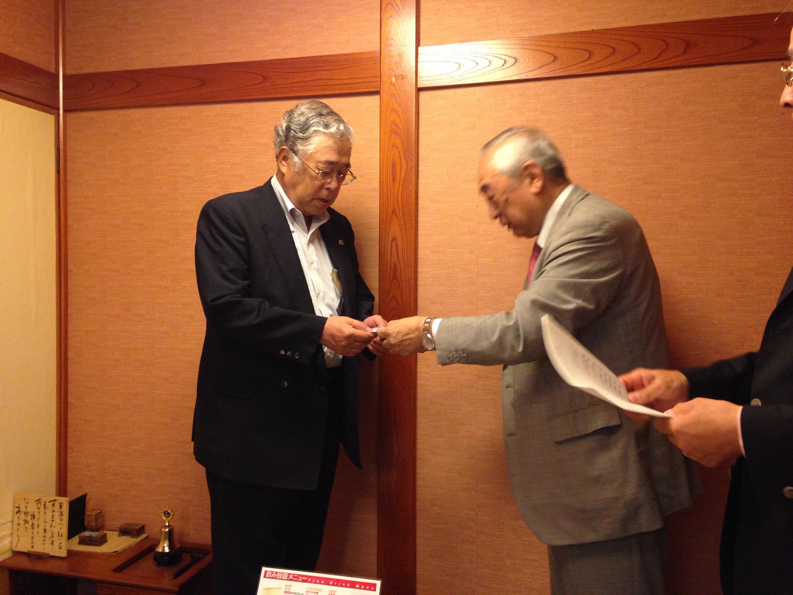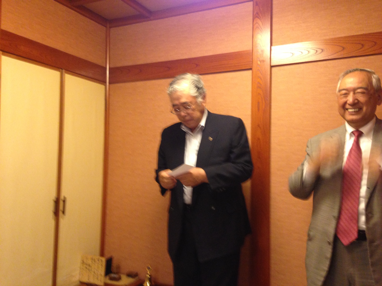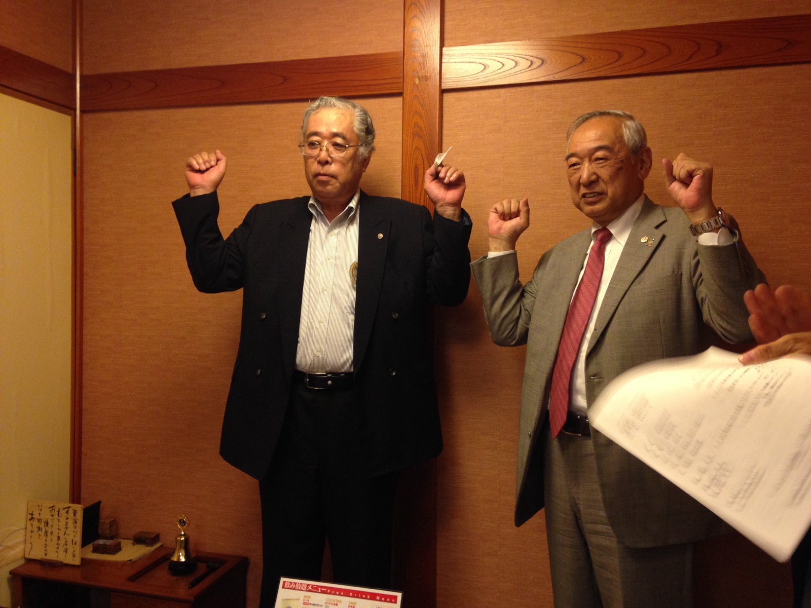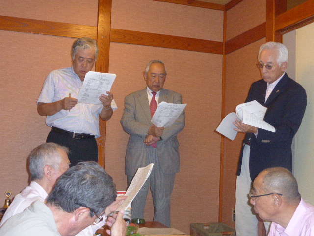 1.開会ゴング並びに会長挨拶 2.“ライオンズの誓い”唱和 3.ビルダーキー賞授与(10名の新会員スポンサー) L比護 了造 4.メンバーシップ アドバンスメントキー賞授与(5名の新会員スポンサー)L甲斐 聡 5.審議事項 1)引継ぎと感謝の夕べ決算報告 2)CN20周年記念行事決算報告について 3)2014年7月〜2015年6月決算報告 4)2014年7月〜2015年6月会計監査報告 5)2015年7月〜2016年6月収支予算 6.事業委員会方針発表 ☆青少年委員会 ☆環境保全委員会 ☆社会奉仕委員会 7.幹事報告 1)スカウトジャンボリー タープテント受領の件(各複合に100張)世界スカウトジャンボリー大会(8月上旬開催)で2週間使用したライオンズマーク入りのタープテントを無償受領の申込をしました。 2)2R2Zゾーン・チェアパーソン公式訪問について 10月9日(金) 農園部会担当例会 3)安井克之国際理事就任祝賀会について(会長宛) 4)山田實紘国際会長 東日本(MD330・331・332・333)公式訪問について 5)合同事務局会長会並びに運営委員会合同会議開催について 8.テール・ツイスタータイム 9.出席率の発表 10.ライオンズ・ローア並びに閉会ゴング |