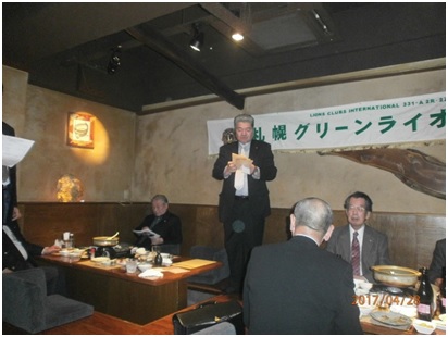 札幌グリーンライオンズクラブ4月第2例会 (長期リサーチ担当 CN例会 通算第534回) 会長スローガン 慈悲の心と和の心 2017年4月28日(金) すすきの文化食堂にて 第一部 幹事報告 1.2017〜2018第二副地区ガバナー立候補辞退について 2.次年度「クラブ新三役・PR委員長セミナー」開催について 日時 6月9日 セミナー 15:00〜16:30 懇親会 16:50〜19:00 (懇親会がクラブ例会とバッテイング) 場所 ロイトン札幌にて 対象者 次期三役・次期PR委員長・次期ZC・次期Z委員 3.岡山次期ZCから4月24日開催された次期ゾーン委員会の報告 第2部 ・4月誕生ライオン L竹内 信也 L小松 隆 おめでとうございます。 ・環境保全委員長挨拶と活動報告 堀束環境保全委員長からACT目的と寒地土木研究所で4月26日実施した千島桜記念植樹の報告。(以下概要) ・この事業はクラブモットーの「緑を愛し地球環境を大切に!」の基本理念に基づき市民に緑を増やし親しんで欲しいとの思いで千島 桜苗木の無料頒布を計画しました。 ・「千島桜基金」充実を目的として募金ACTを計画しました。 以上2つのACTを5月1日・2日に一緒に行う ・構内の桜はやや開花が遅れている・我がクラブ会長以下9名が参加、寒地土木職員さん30名位が立合い。 ・50p位に育った苗木を岡田会長・鎌田所長がそれぞれ紅白のスコップで植樹。 ・すでに寒地土木研究所のHPに記念植樹の概要が載っていること。 ・札幌グリーンライオンズのPRになる事業と思う。 ・上記参加可能者数確認と現地集合時間周知。 ・竹内ゴルフ部会長から今年度日程発表 ・L忠海から5月12日理事会後「岡山せとうちLC」メンバー来札に伴う歓迎プラン発表。 ・岡田会長から前田次期会長につつがなく引き継ぎ出来る見通しが立ったと閉会ゴング。
