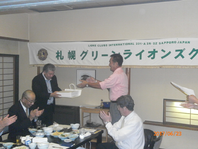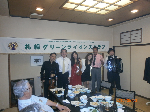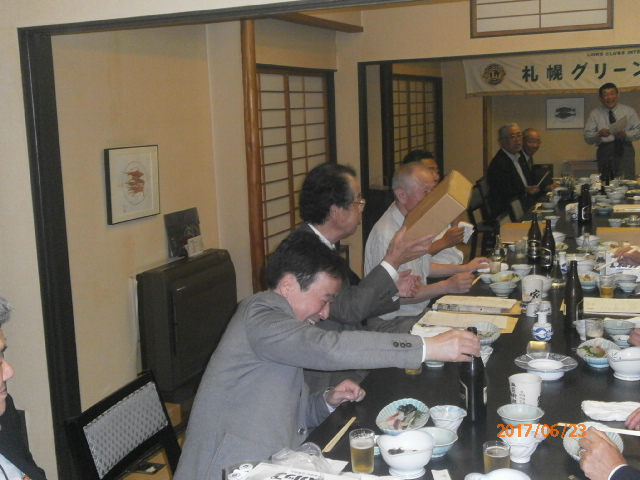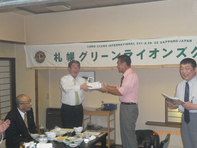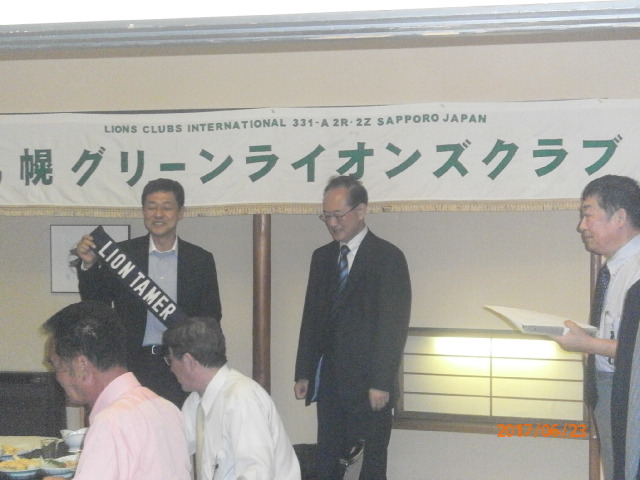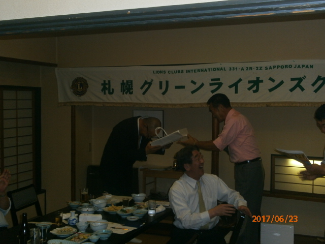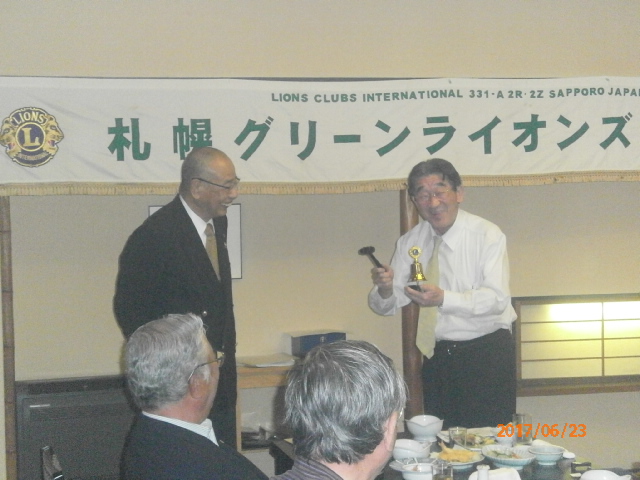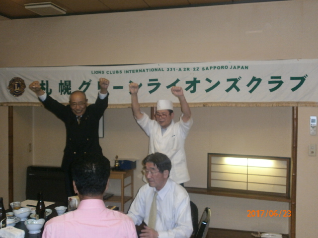 札幌グリーンライオンズクラブ6月第2例会 (通算第538回) 会長スローガン 慈悲の心と和の心 2017年6月23日(金)大和屋にて T表彰 1、国際会長・LCIF理事長感謝状 L高野 倫行 2、100周年記念会員増強賞 L忠海 健三 Uアワードピン贈呈 25年 L高野 倫行 V幹事報告 地区ガバナー公式訪問 8月1日(火)17:00受付・18:00ゴング 札幌グランドホテル 《引継ぎと感謝の夕べ》 実行委員長 L竹内 信也 副実行委員長L忠海 健三 1、ライオンズの歴史や所縁にかんするクイズタイム 副実行委員長L忠海 健三 出題内容はメンバーであれば当然知っていなければならない事柄? 指名されたL達には珍回答もあったが 栄養ドリンク・鴨葱セット(L忠海の特製)・蕎麦・うどん等の景品ゲット 2、アコーディオン1名・バイオリン2名による演奏タイム KKミュージック代表加賀谷恵子様他3名 曲目:愛の讃歌、情熱大陸他 3、新旧5役の引継ぎタイム 現役員は1年間の苦労話 新役員は決意表明 ※現役員にはA5ランクの宮崎和牛プレゼント " 以上で引継ぎと感謝の夕べ終了、 改めまして会長岡田聰Lお疲れ様でした。 L前田伏樹新会長宜しくお願い致します。" | ||||||||||||||||||||||||