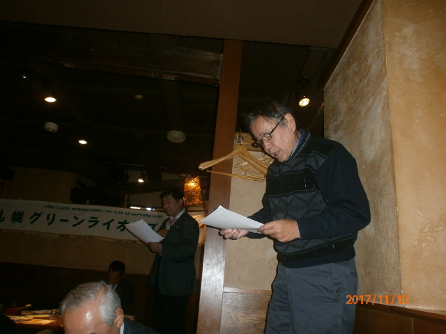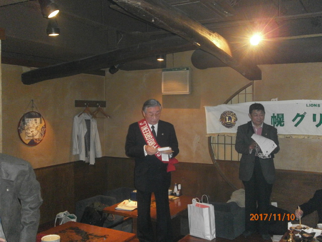 札幌グリーンライオンズクラブ11月第1例会 (特別例会 環境保全委員会担当 通算第547回) 会長スローガン 《豊かな心で、奉仕活動を》 2017年11月10日(金) 18:00 文 化 食 堂 1.開会ゴング並びに会長挨拶 会 長 L前田 伏樹 2.“ライオンズの誓い”唱和 3.2016〜17年度 クラブ会員満足度向上アワード授与 前会長 L 岡田 聰 4.アワード贈呈 L忠海健三 15年 アワードピン及びマイルストーン・シェブロン 5.100周年記念地区特別事業報告 会 長 L前田 伏樹 6.FWTセミナー報告 2R2Z Z L工藤 修 7.小学生向けネットマナー講座講師養成セミナー報告 2R2Z Z L工藤 修 8.幹事報告 幹 事 L竹内 信也 1)2018年在札37LC合同新年交礼会について 日 時 2018年1月4日(木) 受付16:00〜 開始 17:00〜 会 場 札幌パークホテル 地下2階「パークプラザ」中)南10条西3丁目 п@511−3131 締切12/5(火) 2)2018年夏期YCE派遣生募集について 派遣国 北米、オーストラリア、マレーシア、台湾、シンガポール、ヨーロッパ等 派遣期間 7月上旬〜8月下旬予定 資 格 出発日満16歳〜21歳 日常生活に困らない、意思の疎通が出来る程度に会話が出来ること(原則として英語) | ||||||||||||||