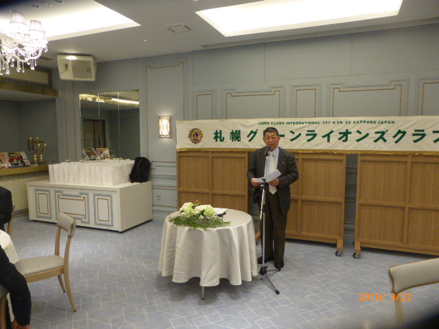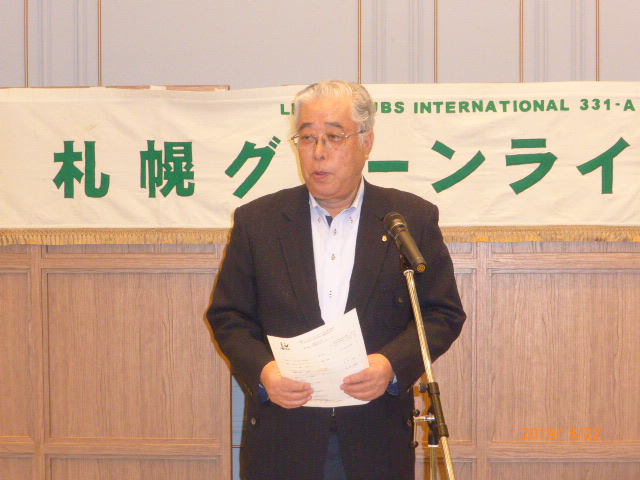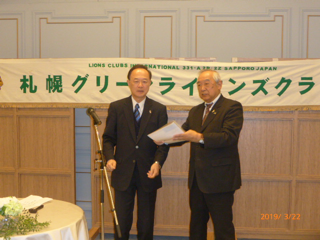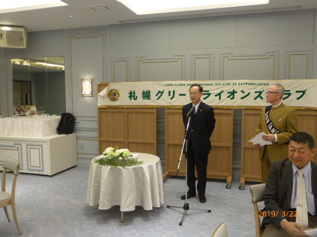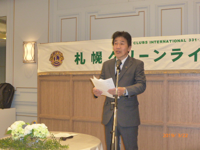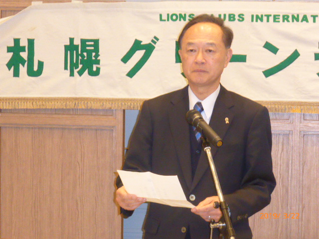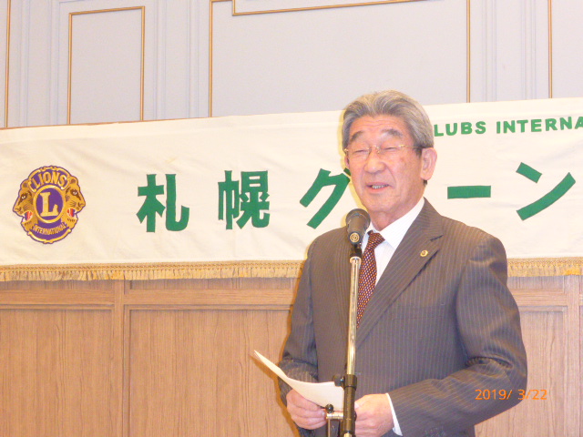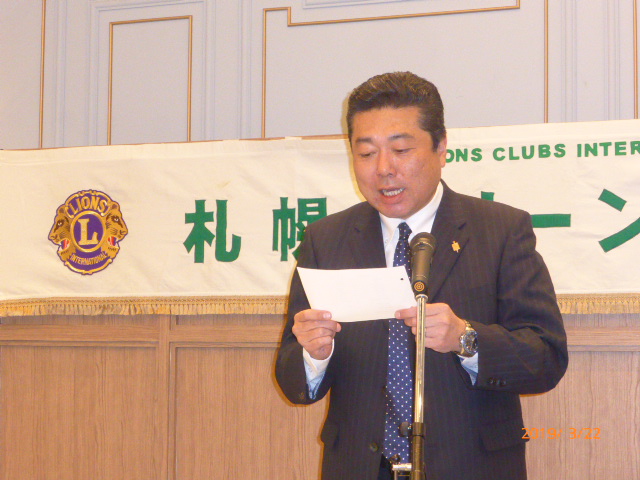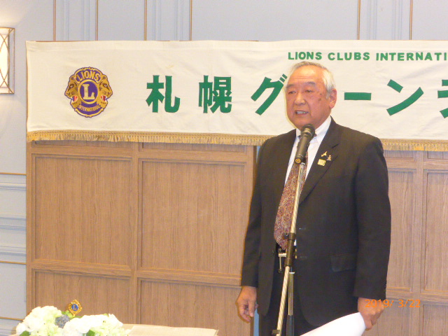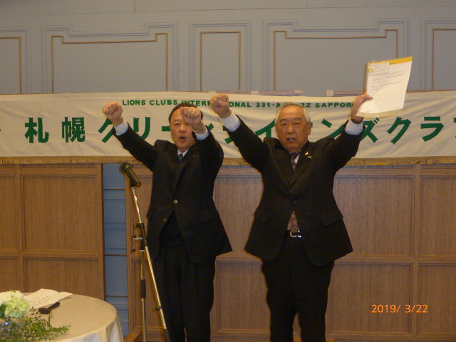 札幌グリーンライオンズクラブ3月第2例会(CN記念例会・100%例会通算第580回) 会長スローガン 未来と平和にウィサーヴ 2019年3月22日(金)18:15於:ClubGarden(クラブガーデン) 1.開会ゴング並びに会長挨拶 会長 L浅水 正 2.国歌「君が代」並びに「ライオンズクラブの歌」斉唱 3.ライオンズの誓い唱和 4.LCIF理事長公式訪問記念アワード受賞の贈呈 会 長 L浅水 正 L高野倫行(MJF10口以上献金者対象) 5.プログレスMJFピン・ライオンズ・サポーターピン・会長L浅水正 331A地区ガバナーピンの贈呈 L竹内 信也 L池田 佳奈美 6.DiamondCentennialAwardの授与 会 長 L浅水 正 (ダイヤモンドセンティニアルアワード) L岡山 豊昌 7.幹事報告 幹 事 L甲斐 聡 1)佐川急便請求の預金口座振替について 8.その他 1)4月12日(金)次期役員選挙例会 2)藤沢グリーンLC事務局住所移転 新住所〒252-0805神奈川県藤沢市円行1−7−9矢萩様方 TEL・FAX・メルアドは変更なし 〈第二部〉 司会進行 L山田 一男 1.実行委員長挨拶 L前田 伏樹 2.出席率の発表(出席率100%達成を宣言) 会員委員長 L山口 雅徳 3.CN記念例会・100%例会達成を称え 会長挨拶 会 長 L浅水 正 4.CN記念例会・100%例会の祝辞 次期会長 L竹内 信也 5.CN記念例会・100%例会を祝してウィサーブ 初代会長 L山本 弘詔 6.“また会う日まで”斉唱 7.ライオンズ・ローア並びに閉会ゴング 会 長 L浅水 正