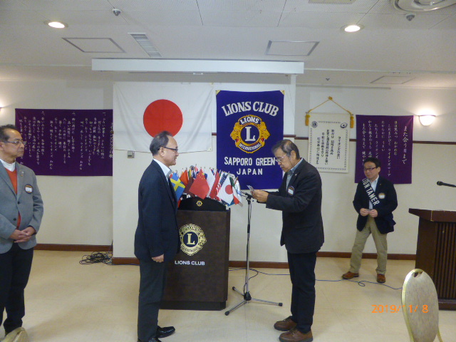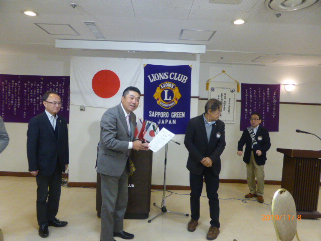 札幌グリーンライオンズクラブ11月第1例会(3役担当 通算第595回) 会長スローガン 夢と情熱そして勇気にウィサーヴ 2019年11月8日(金)18:15於:三越4階ライラック 1.開会ゴング並びに会長挨拶 会長 L竹内 信也 2.国歌「君が代」並びに「ライオンズクラブの歌」斉唱 3.“ライオンズの誓い”唱和 4.審議事項 5.第2回諮問委員会の報告 幹事 L忠海 健三 6.331A地区ガバナーよりLCIF献金の感謝状とガバナーピンの授与 7.幹事報告 幹事 L忠海 健三 1)2020-2021年度 第二副地区ガバナー立候補について 2)2020年夏期YCE派遣生募集について 3)2020年在札37LC合同新年交礼会について 4)柏グリーンライオンズクラブCN40・第36回グリーン盟友フォーラム(予備登録)について ウィサーブ 8. 呉グリーンLCCNと岡山せとうちLC交流会の報告 9.その他 10.テール・ツイスタータイム テール・ツイスター L山口 雅徳 11.出席率の発表 会員委員長 L岡山 豊昌 12. “また会う日まで”斉唱 13.ライオンズ・ローア並び