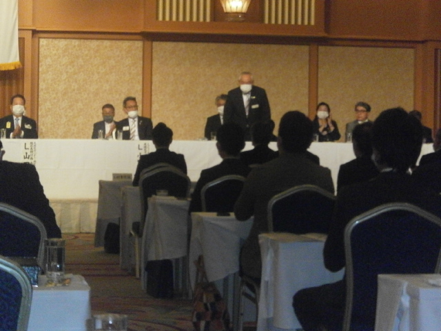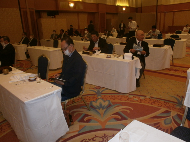 札幌グリーンライオンズクラブ7月第2例会 (通算第608回) 会長スローガン 健やか グリーン 7月28日 ガバナー公式訪問 7月第2例会 6:30〜 パークホテル コロナ禍を意識し大きく様変わりした公式訪問でした。例年の地下2階パークホールではなく3Fで開催。席は写真の様に教室形式の長テーブルに2人掛け。従って食事も円卓・大皿料理でなく弁当を開会ゴング前に食すスタイル。勿論アルコールも有りません。今回の幹事クラブは北の杜LCでした。諏訪ガバナーから今期方針発表と出身クラブのリジョンなのでご支援お願いしたいとの挨拶がありました。