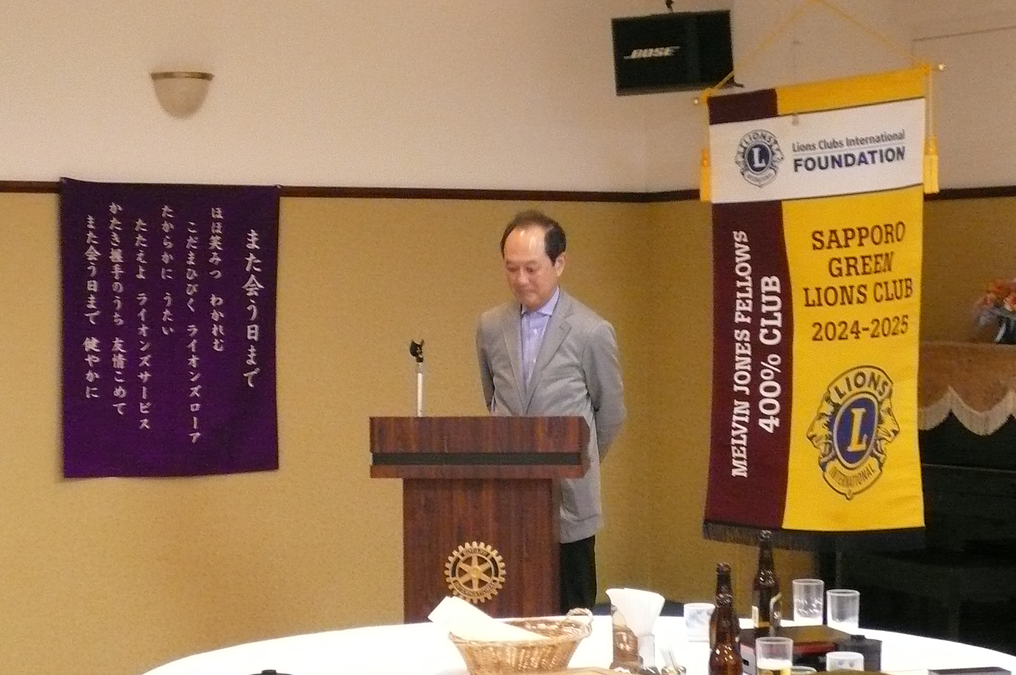 札幌グリーンライオンズクラブ5月第一例会(通算第713回) 会長スローガン みんなの参加で充実アクト 2025年5月9日(金)18:15於:三越4階ライラック 1. 開会ゴング並びに会長挨拶 会長 L帆先 久和 2.国歌「君が代」並びに「ライオンズクラブの歌」斉唱 3."ライオンズの誓い"唱和 4.千島桜苗木頒布と募金の報告について 環境保全委員長 L甲斐 聡 5.第62回OSEALフォーラム札幌ボランティアご協力 会長 L帆先 久和 アンケートのお願い 6.幹事報告 幹事 L浅水 正 1)第71回地区年次大会会長登壇について 2)第71回地区年次大会次期ホストクラブ会長・幹事登壇について 3)第71回地区年次大会クラブバナー搬入について 4)小児がん支援「レモネードスタンド」開催の協力について 5)札幌すすきのLC30周年記念式典終了のお礼について 7.その他 8.テール・ツイスタータイム テール・ツィスター L山本 弘詔 9.出席率の発表 会員委員長 L山口 雅徳 10."また会う日まで"斉唱 11.ライオンズ・ローア並びに閉会ゴング 会長 L帆先 久和 |