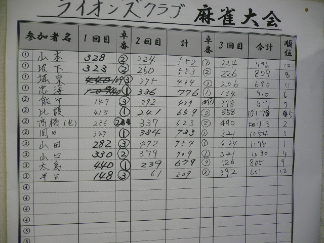 第3回麻雀大会 3/31(土)14:00「楽縁」にて開催 ゲストは昔のライオン仲間 能中さん、太島さん、半田さん 含め3組12名で開始。優勝はチーの仕方分らない実力者L山田 一男、 準優勝は点数計算出来ず、直前まで本で勉強していたL高橋 光任、 1位は麻雀部会長のL岡田 忠恭、2位は30分遅刻のL山口 雅徳、 3位はL比護 了造で大接戦、優勝から3位までの差は16,100点でした。